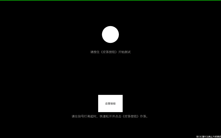 下面我们开始进行视简单反应时测试,屏幕中央会有一个圆形信号灯和一个应答按钮,首先按住按钮开始测试,当信号灯变色时请立即松开按钮并再次点击进行应答。