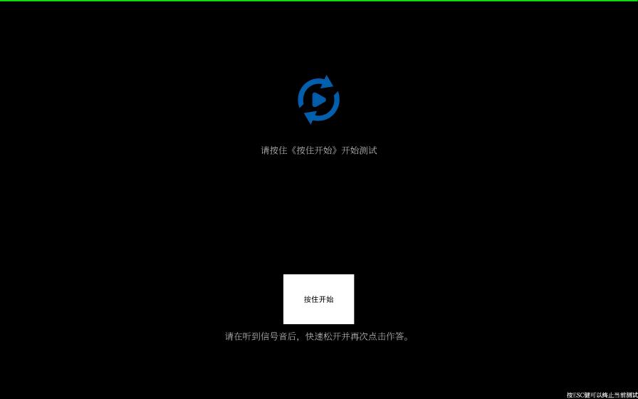 下面我们开始进行听简单反应时测试,屏幕上会有一个应答按钮,按住按钮测试开始,听到信号铃后,请立即松开按钮并再次点击进行应答。