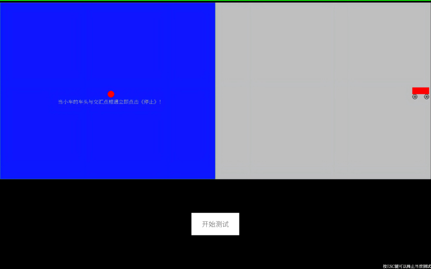 下面我们开始进行运动知觉测试,屏幕上有一辆汽车、一个障碍物,障碍物上有一个交汇点。点击《开始测试》按钮后汽车会由左向右匀速移动,请注意汽车的速度,当汽车进入障碍物后,需要根据汽车的速度来判断它的位置,感觉小车达交汇点时,请立刻点击《停止》。测试将进行3轮,每轮3次,每一轮小车行驶速度会加快。